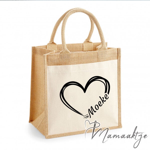 Toffe herbruikbare tas van jute, geschikt voor boodschappen of als cadeautas met bedrukking. Ideaal als cadeautje voor je lieve Mama, Moeke of Oma. Afmetingen: 30x30 cm (Draaglussen zijn 40 cm lang)